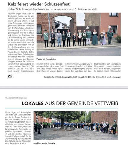 Am Samstag, 12. Juli 2025 geht das „Kölsch im Dörp Open-Air“ in die nächste Runde. Nachdem im letzten Jahr rund 1.300 Besucher das Vollkonzert der RÄUBER auf dem Sportplatz besuchten, werden 2025 die "BRINGS" ein Vollkonzert mit den KELZ BOYS als Support-Act bei uns im Dorf spielen, im Vorverkauf wurden 1800 Karten verkauft.
